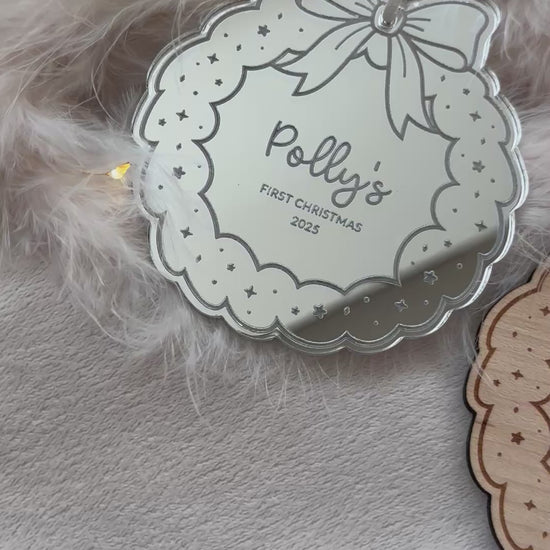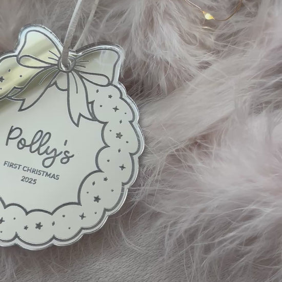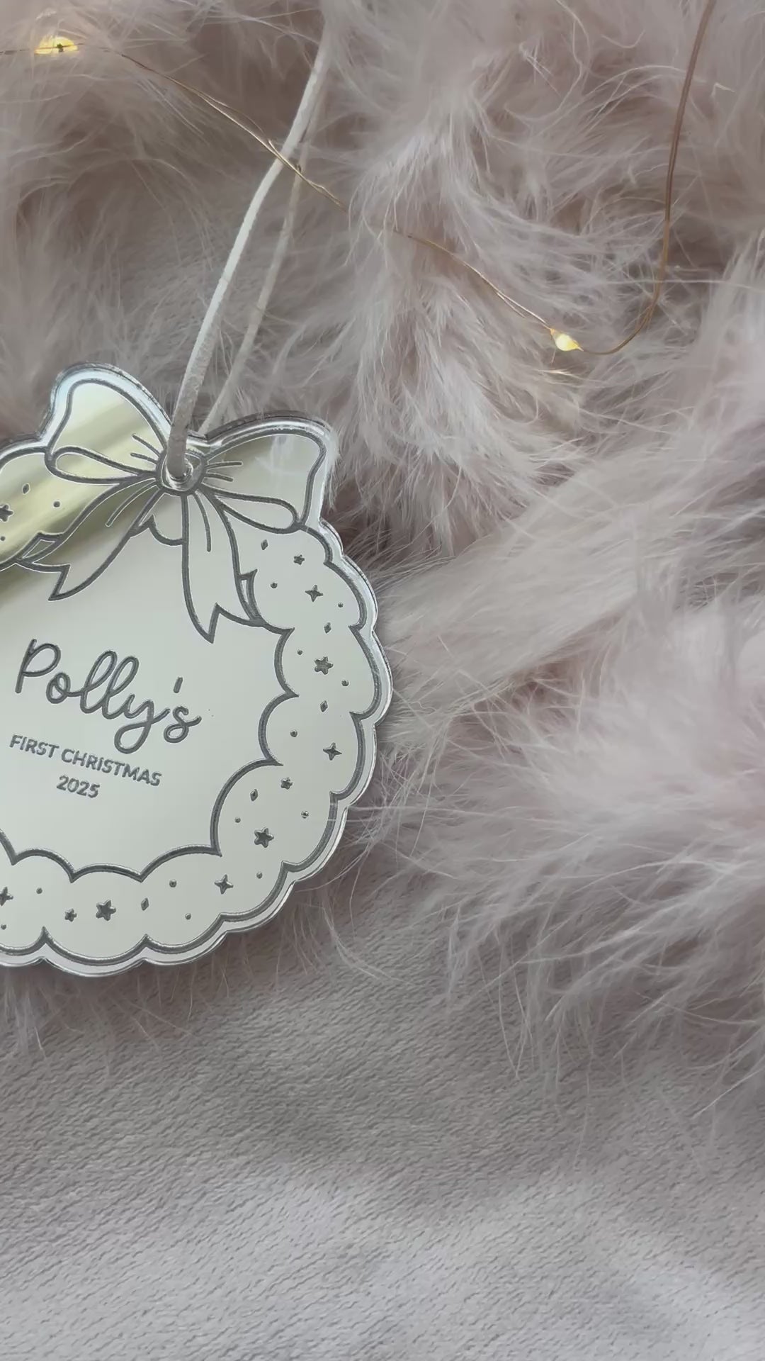 Beautiful Bow wreath Christmas bauble. Whether it’s baby’s first Christmas and you are looking for something special to keep or you want to add a personalised bauble to your tree for this year this is perfect!