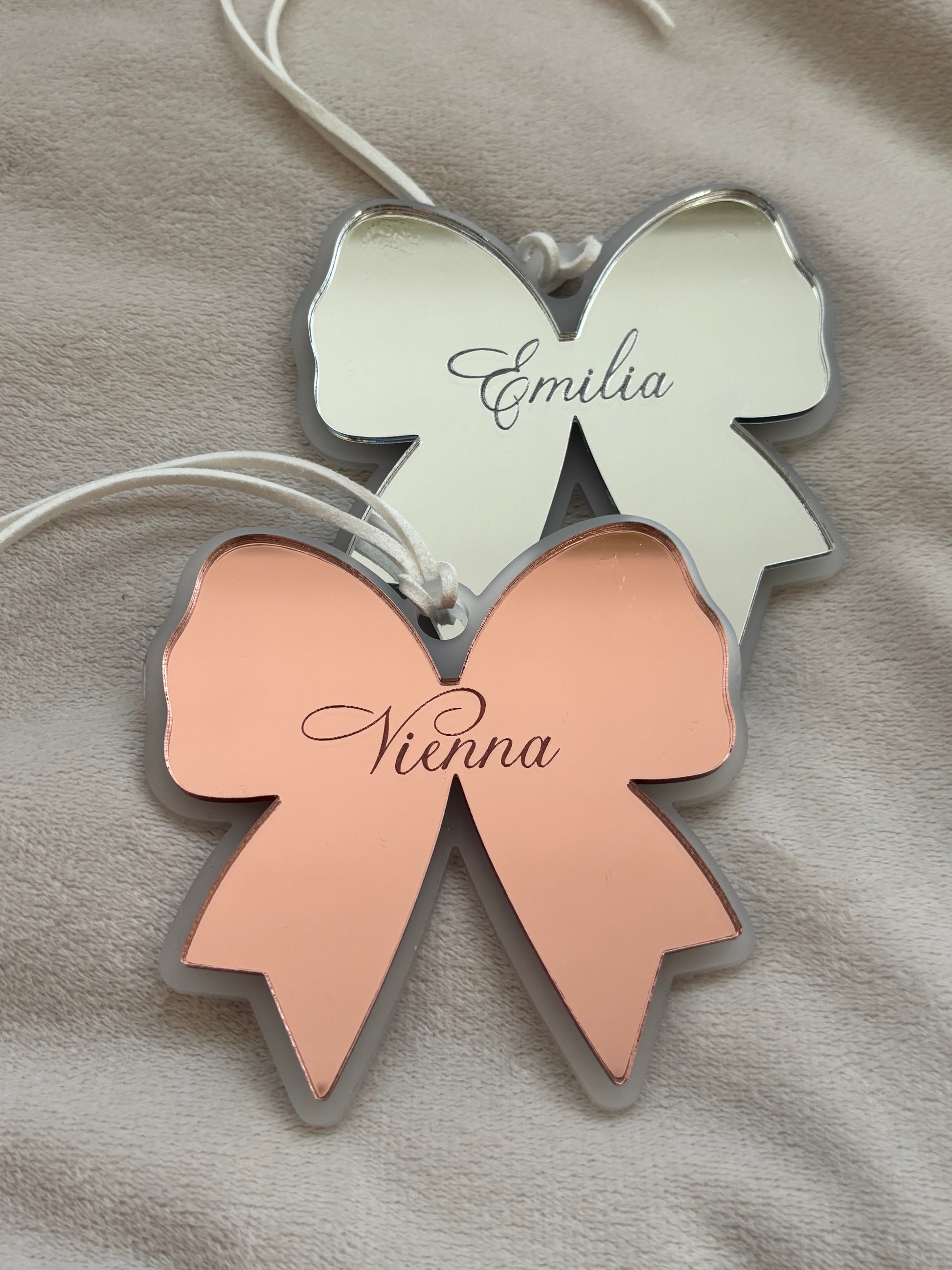 These stunning bow baubles are a gorgeous addition to any tree, engraved in an elegant script font and made from high stunning mirror acrylic they have a luxury feel.