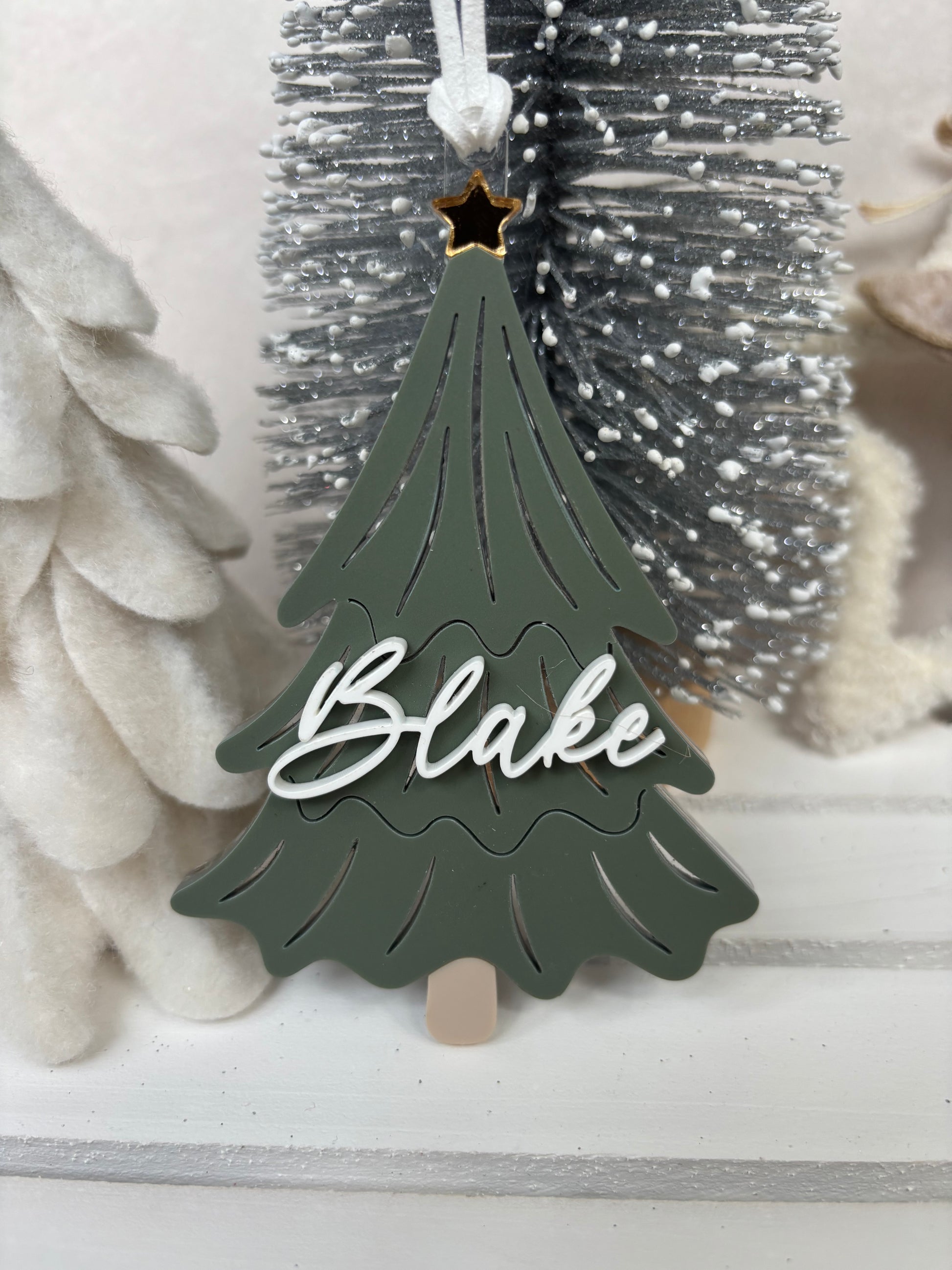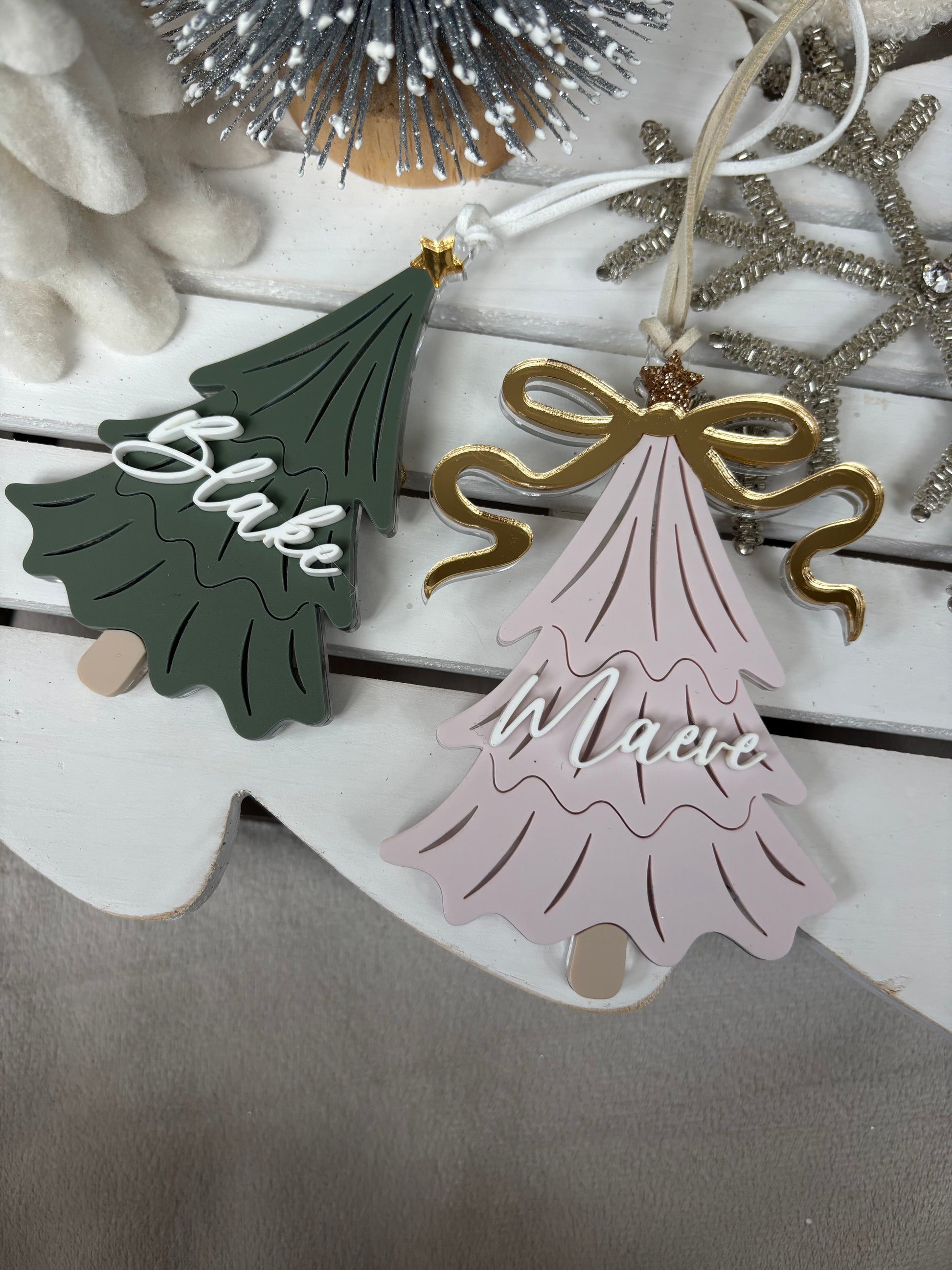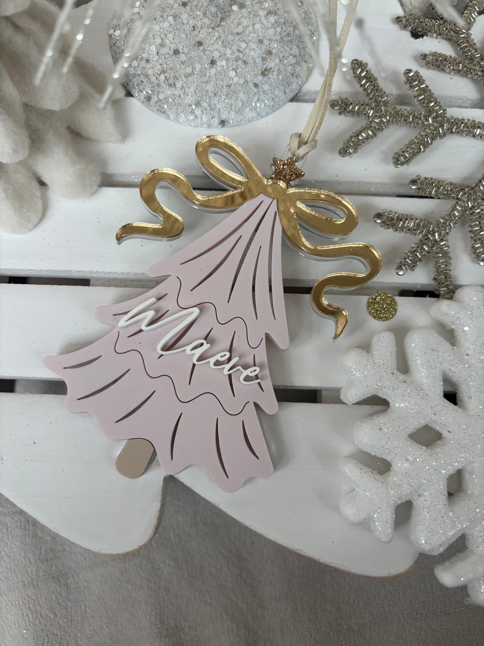 Each bauble measures approximately 12cms and is made from layered acrylic with metallic details. You can select from the pine green plain tree or dusky pink version with its shiny bow.
