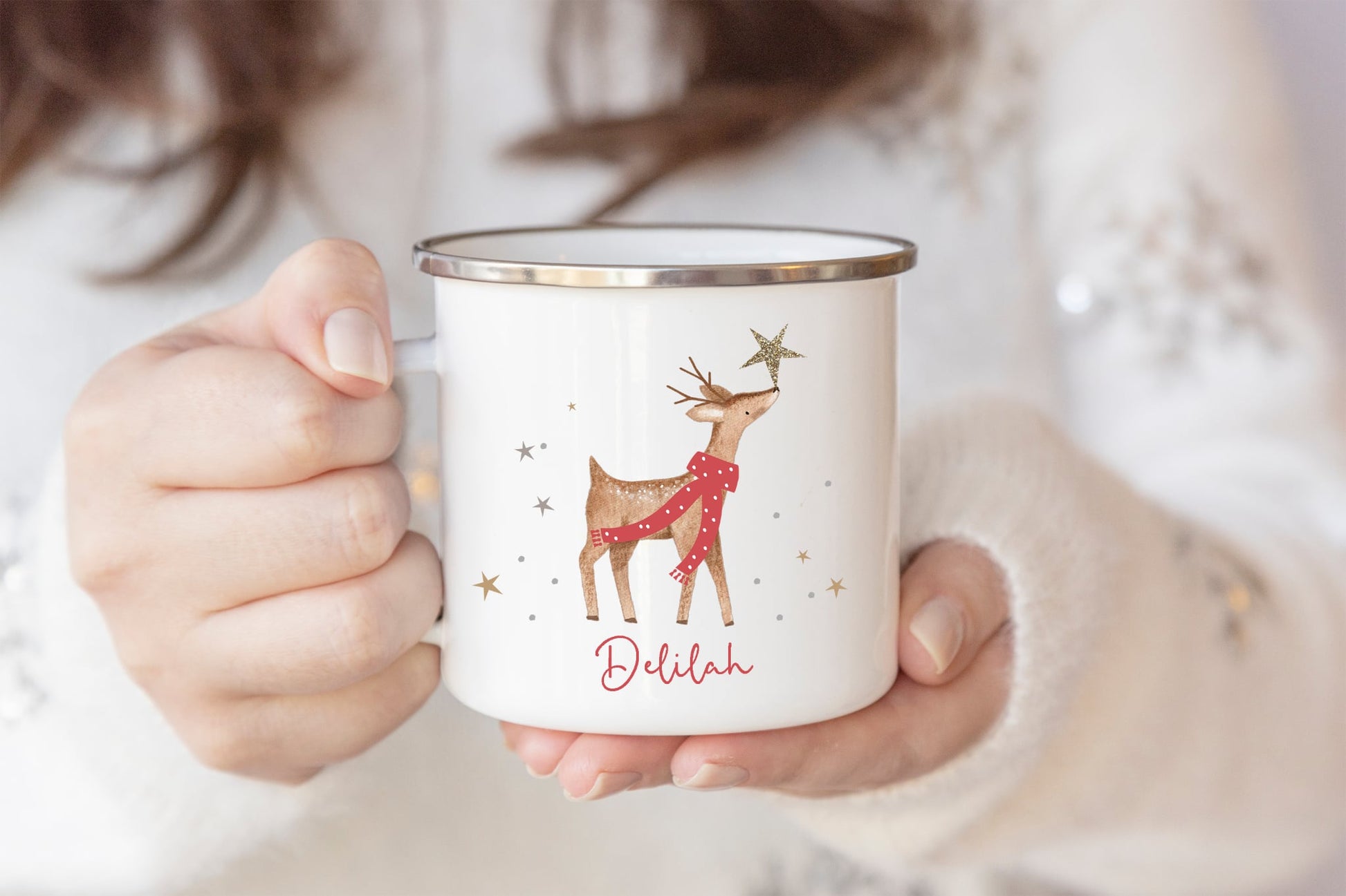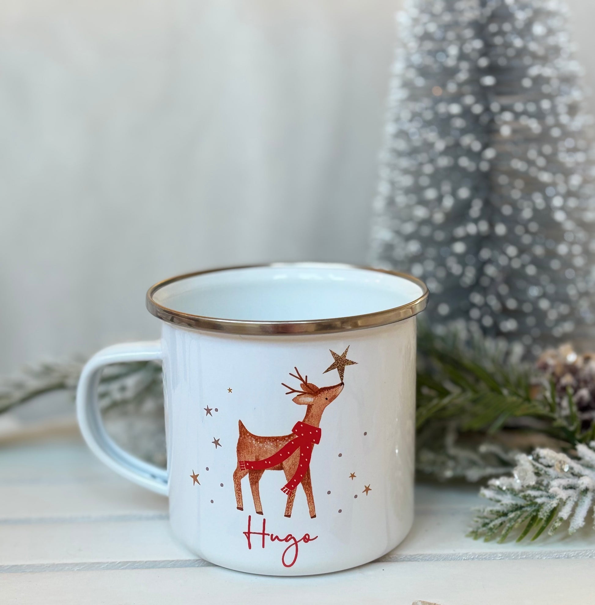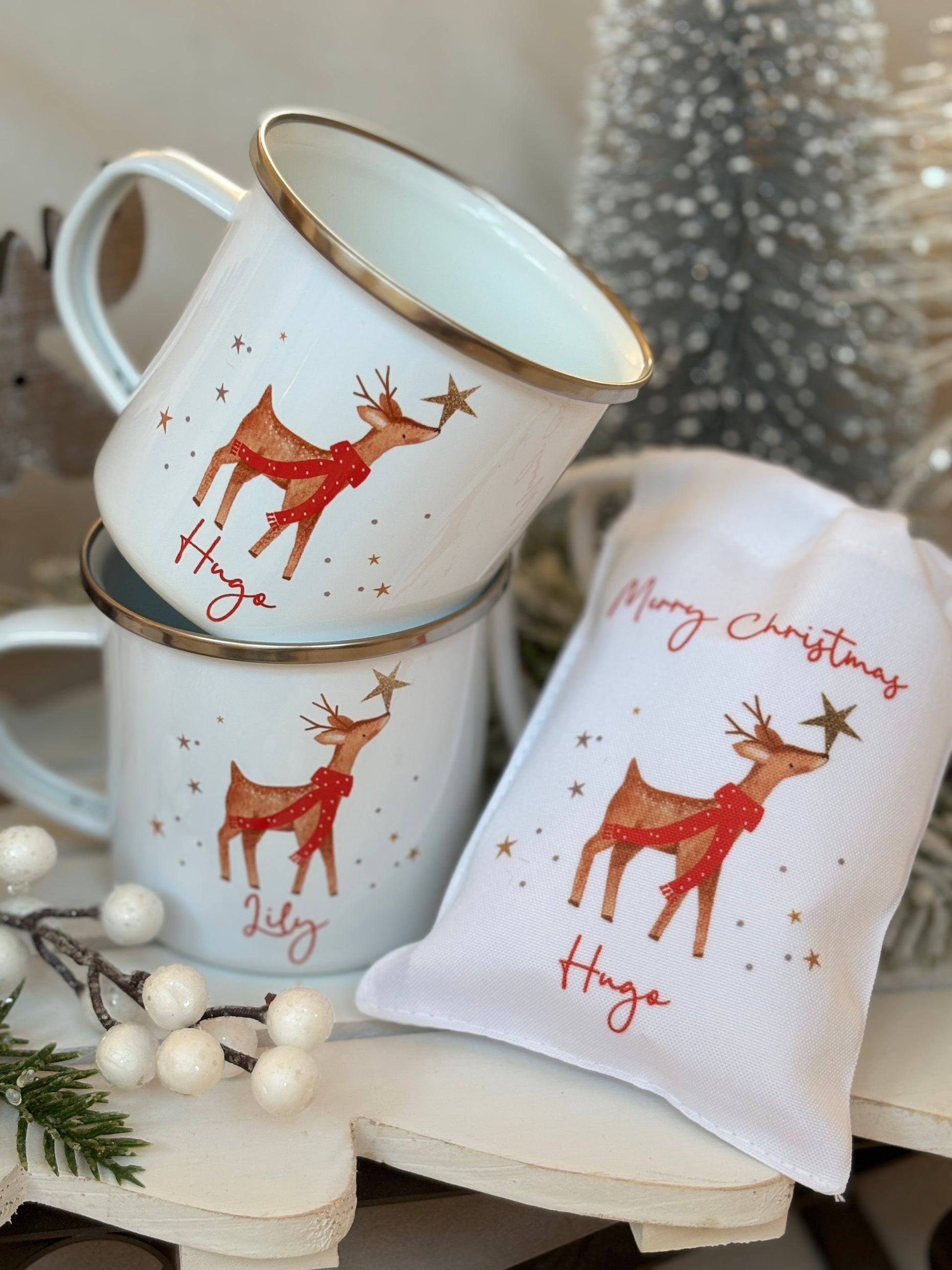 Each mug is printed with beautiful watercolour reindeer and finished with your child’s name.